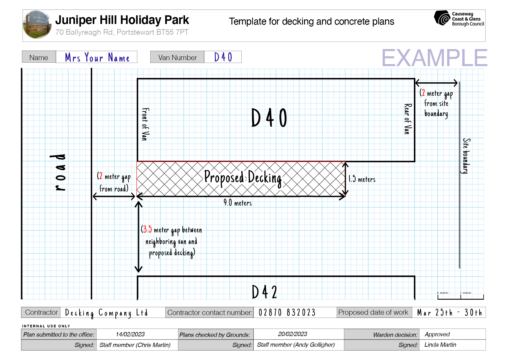 This section contains information about how to proceed with having decking built next to your van. There are strict fire safety regulations which you must adhere to. All plans for any works around your van must be approved by the office. We have also included contact numbers for approved decking specialists. Note, any contractors who carry out work on a council site will need to have a risk assessment and their up to date Public Liability Insurance documentation filed with the office before work can begin.
